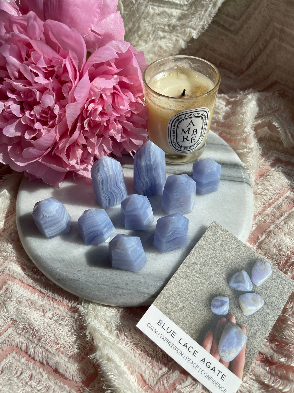 A healing stone with soft energy, Blue lace agate carries a cool and calm energy that can bring peace even to the chattiest of minds.  A supportive and nurturing stone to release your fear of rejection and judgement,  this crystal is closely associated with throat chakra to free you from any communication sluggishness.   As a peaceful  vibrational stone, it attracts emotional stability, confidence and mental clarity.