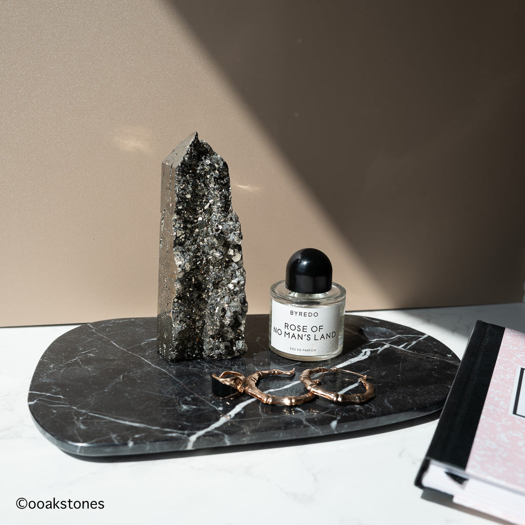 Carved into an elegant obelisk form, this Pyrite tower stands like a pillar of focus and resilience, helping to anchor the energy of a space while encouraging confidence and clear intention. A striking piece for a desk, workspace, or home, it brings both grounding presence and bold natural beauty.